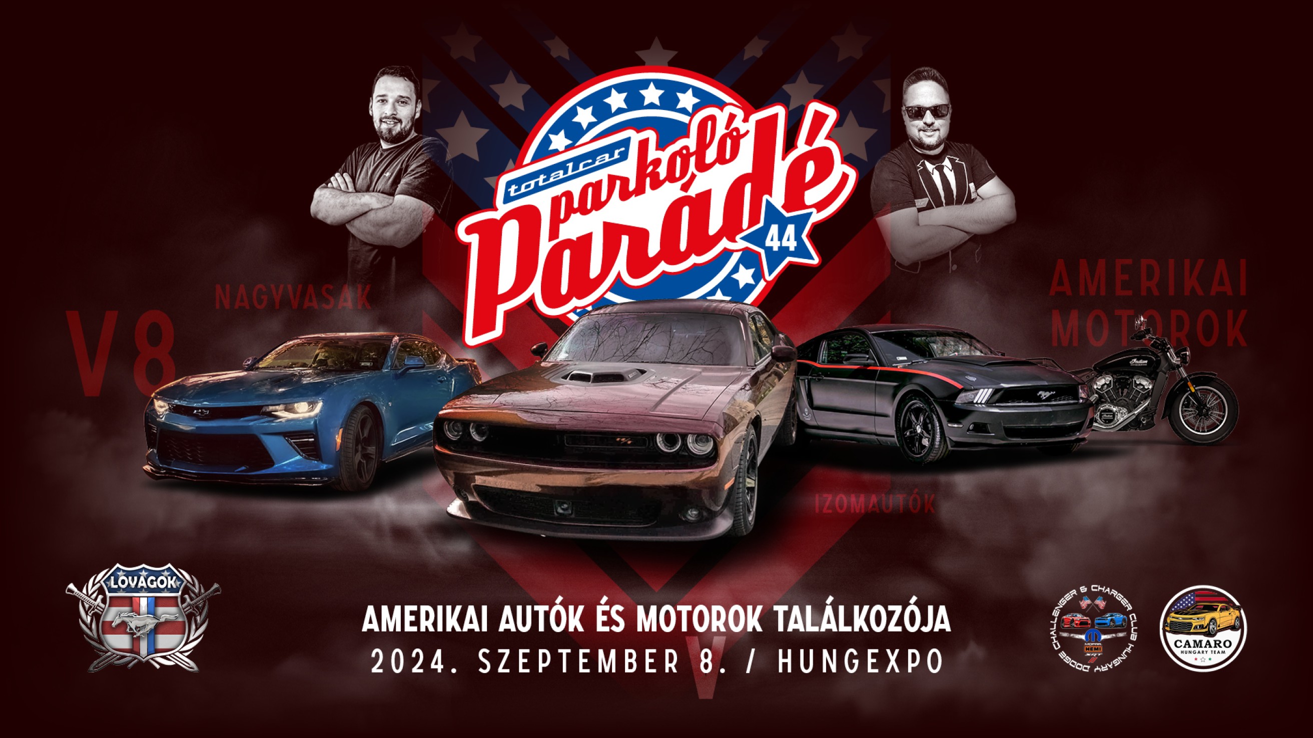 A 2024-es utolsó Parkoló Parádé fedőneve Szeptember V8, amikor egybegyűlik majd minden, ami fastback, boattail, pickup, muscle car, pony car, small block, big block, Hemi block, turbocharger, supercharger, horsepower. Gyere, hallgasd, lásd, érezd az 1-8-7-2-6-5-4-3 lüktetést velünk, mert ez most ünnep, az amerika vasak ünnepe. Gyere autóval vagy motorral, hozd a haverod, a csajod, a családod!